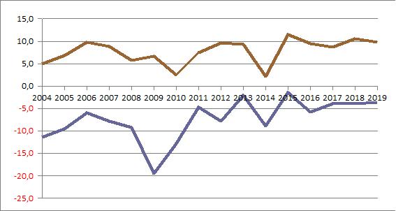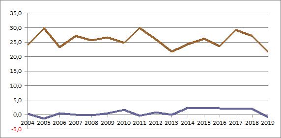 | 2019 | -0,40 | 4,06 | 5,56 | 8,99 | 10,44 | 18,77 | 18,83 | 18,67 | 13,34 | 9,56 | 4,00 | 2,84 | ||