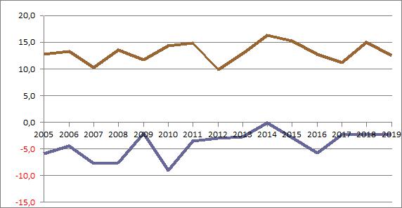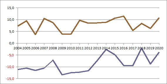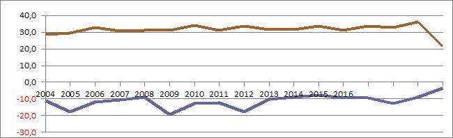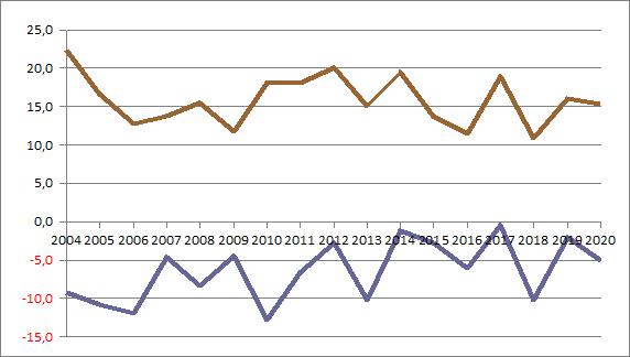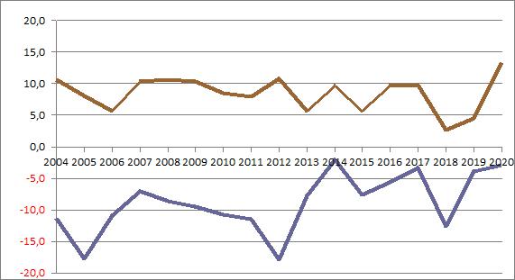 | 2017 | -2,29 | 2,63 | 6,80 | 6,73 | 13,91 | 17,88 | 14,30 | 16,84 | 12,12 | 10,19 | 3,71 | 1,47 | ||