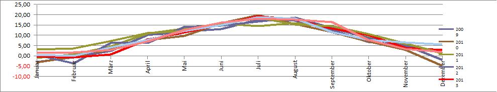 | 2009 | Temp schnitt | 7,58 | -2,93 | -0,74 | 2,31 | 10,18 | 11,91 | 13,05 | 17,66 | 17,00 | 12,60 | 6,72 | 5,10 | -1,87 | |