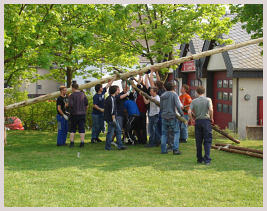 bis zum Feuerwehrhaus zu tragen. Dort wird er dann geschmückt und unter größten Anstrengungen in die Senkrechte gebracht.